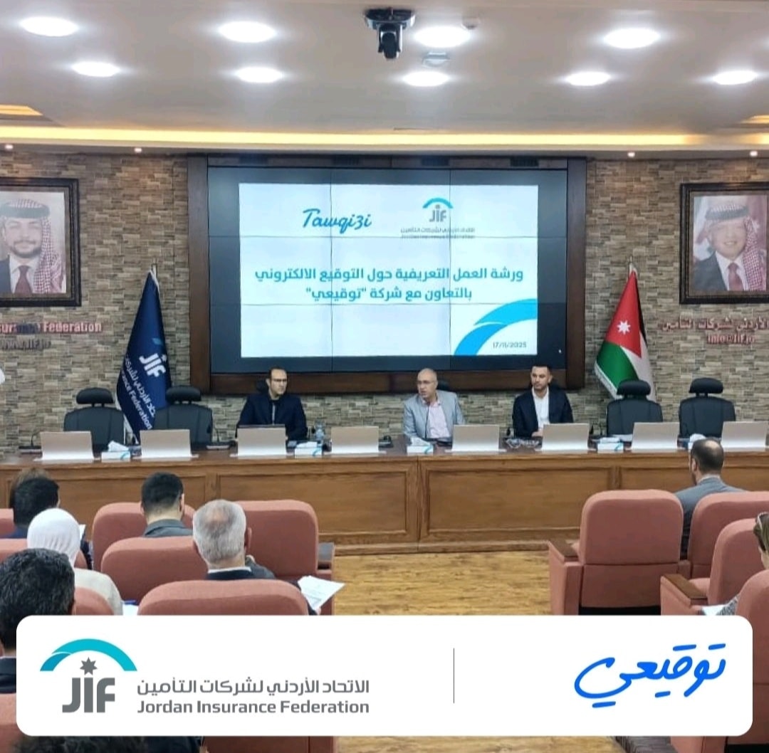 انسجاما مع توجهات الاتحاد لدعم وتعزيز عملية التحول الرقمي في قطاع التأمين ورشة عمل تعريفية بالتعاون ما بين الاتحاد الأردني لشركات التأمين وشركة توقيعي"حول التوقيع الالكتروني ومزايا استخدامه من شركات التأمين 1/12/2025