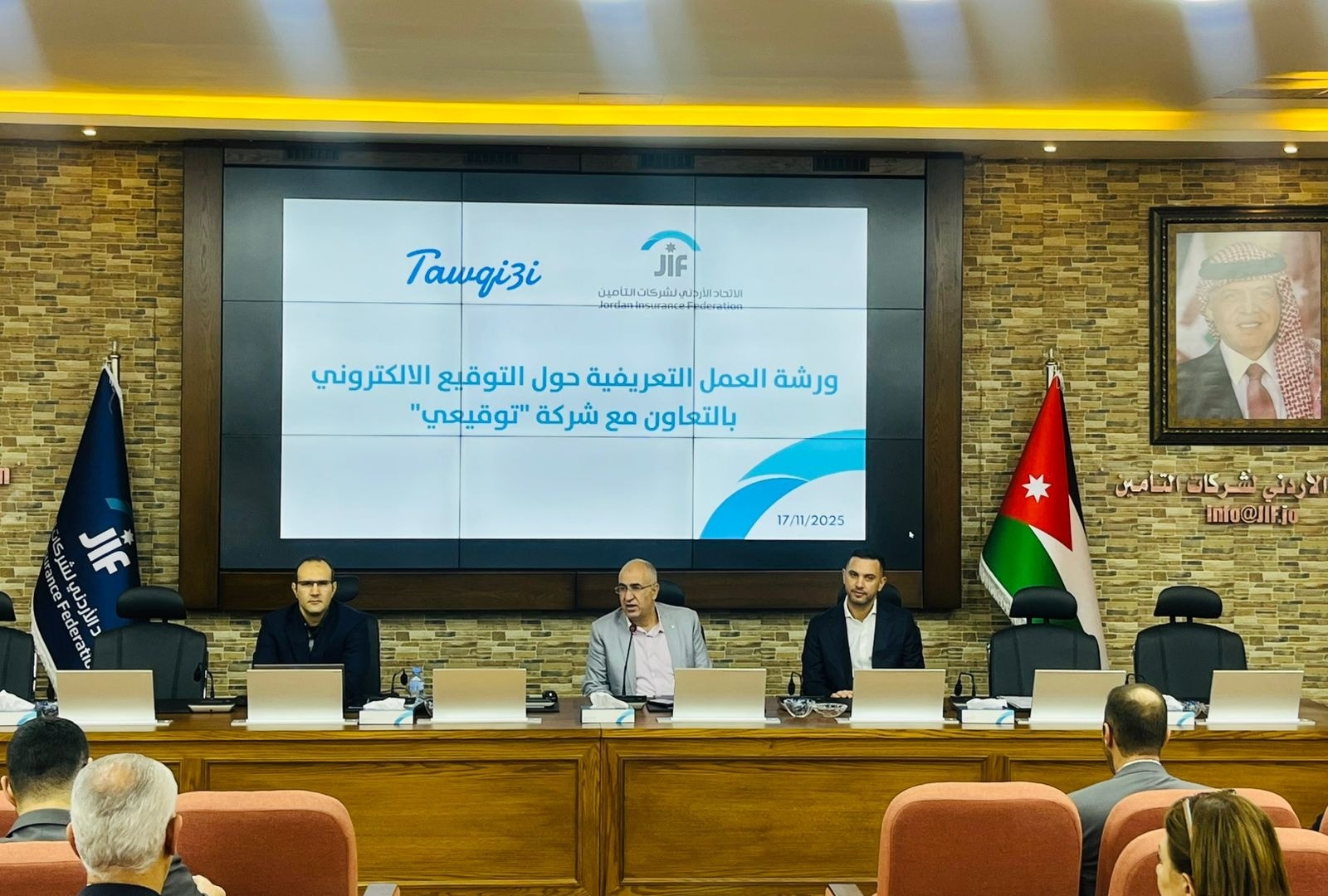 انسجاما مع توجهات الاتحاد لدعم وتعزيز عملية التحول الرقمي في قطاع التأمين ورشة عمل تعريفية بالتعاون ما بين الاتحاد الأردني لشركات التأمين وشركة توقيعي"حول التوقيع الالكتروني ومزايا استخدامه من شركات التأمين 1/12/2025